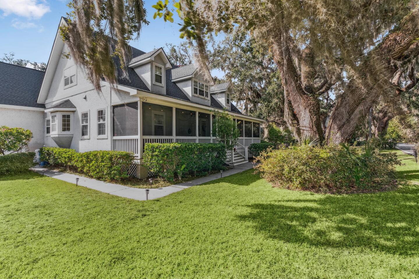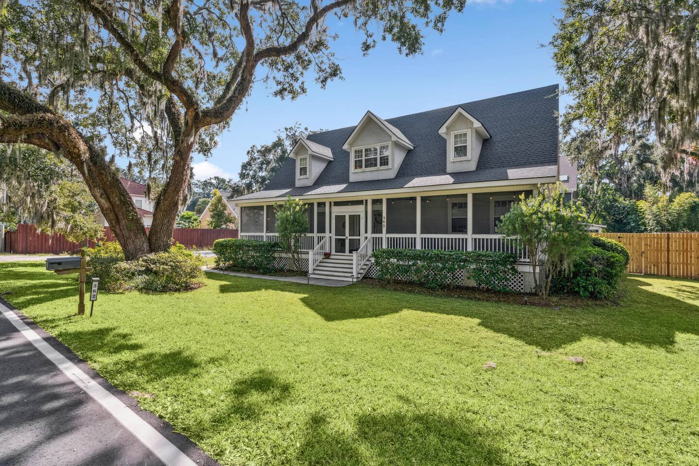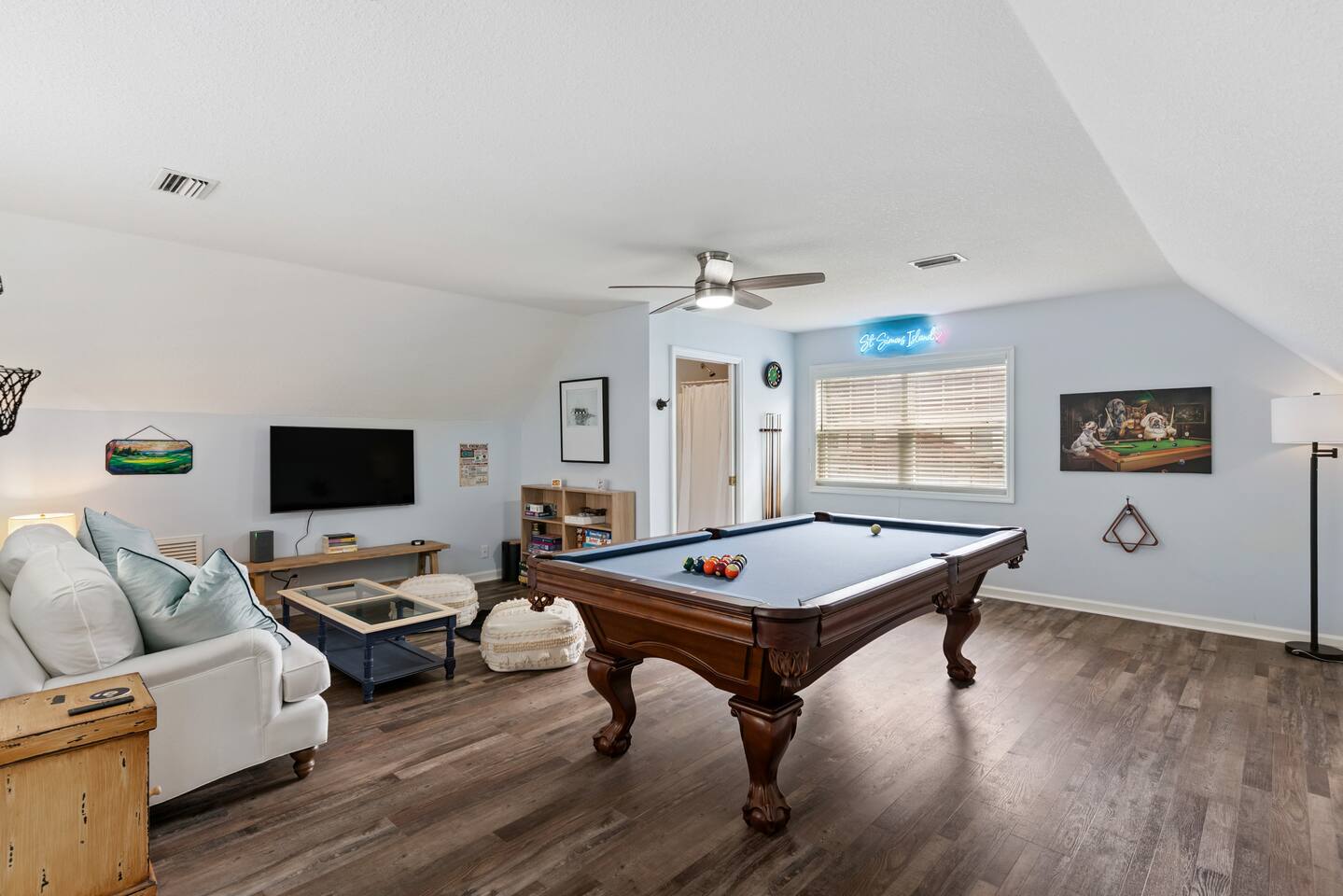 Welcome to Carol's Retreat, where coastal charm meets comfort in the heart of St. Simons Island, GA. This spacious (4,000 sq. ft.), 4- bedroom, 4.5 - bath retreat sleeps 10 with plenty of space for everyone and offers the perfect blend of relaxation and fun — ideal for families, small groups, or golf weekends. Spend your mornings sipping coffee under the oaks, then head to the beach (everything you need is ready — buggy, tent, cooler, and chairs). Afternoons are for friendly games of pool, reading by the upstairs chaise, or BBQs in the private backyard. Evenings? Firepit lit, cornhole out, laughter flowing. The home features two ensuite bedrooms, plush bedding, blackout window dressings, and thoughtful touches in every room — from irons and steamers to cozy blankets for porch nights. The British-themed bunk room is a guest favorite, while the primary suite’s spa bath offers pure serenity after a sun-soaked day. You’ll find a fully stocked kitchen with small appliances, bakeware, and serving pieces (even turkey pans for holiday stays). Dine at the elegant table for 8 or pull up a barstool for a casual breakfast before heading to the Sea Palms (3 minutes) or King and Prince (10 minutes) golf courses. This mid-island gem sits on a peaceful street within walking distance of Harrington Park and Bennie’s Red Barn (15 minute walk or 2 minute drive). Local favorites include La Plancha for incredible fish tacos (5 minute drive), Sal’s Pizza for authentic Italian (8 minute drive), and Village Creek Landing (3 minutes) where Southeast Adventure Outfitters offers guided kayaking, boating, fishing, and birding tours — or bring your own kayak and launch right there. For more outdoor fun, enjoy horseback riding at Frederica Stables (4 minute drive) or visit The Farm at Oatland North, a charming animal sanctuary (7 minute drive). Seasonally, don’t miss the arts and crafts shows in the village, often hosted throughout the year and especially lively in summer. Whether you’re here to unwind, reconnect, or explore everything St. Simons Island has to offer, Carol's Retreat welcomes you like a dear friend — classy, coastal, and full of heart.